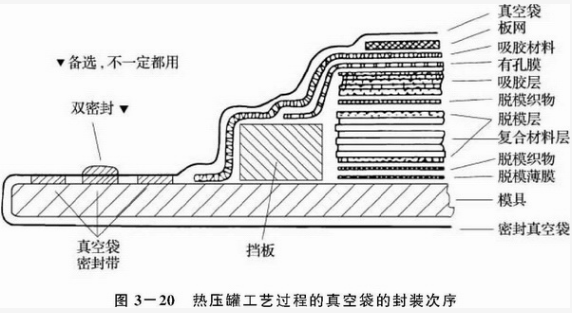 第3步,固化準(zhǔn)備過(guò)程。它包括制件裝袋、輔助材料的裁切、鋪放等。在某些特殊情況下鋪層和固化為不同的模具,因此該操作也包括從鋪貼模具將完成鋪貼的制件轉(zhuǎn)移到固化模具中。通常固化準(zhǔn)備工放等。在某些特殊情況下鋪層和固化為不同的模具,因此該操作也包括從鋪貼模具將完成鋪貼的制件轉(zhuǎn)移到固化模具中。通常固化準(zhǔn)備工作包括制件、模具、真空袋和輔助材料的準(zhǔn)備。其中,必須使用的輔助材料包括脫模材料、透氣材料(用以均勻地分散真空袋體系內(nèi)的真空)等。從圖3- 20中我們可以看到熱壓罐工藝過(guò)程的真空袋的封裝的材料及次序。