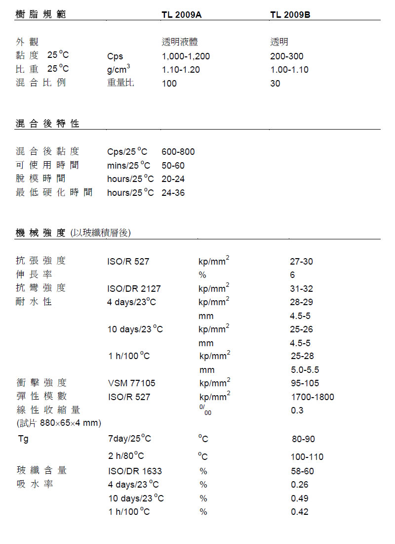 *測試試片: 以玻纖布手積層至7層達3 mm厚度,經長溫7天硬化或40 oC 12小時硬化